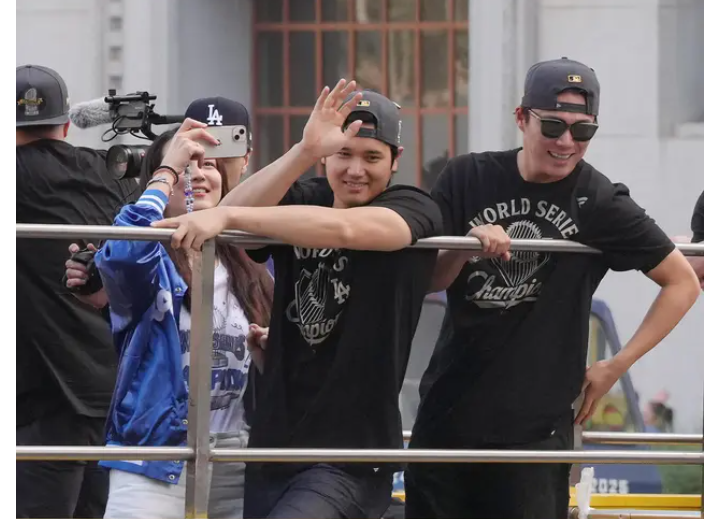 同パレードには大谷妻の真美子さんも参加。大谷の背番号が入ったドジャーブルーのスタジャンに優勝記念Tシャツを着用し、ファンからの祝福に応えていた。